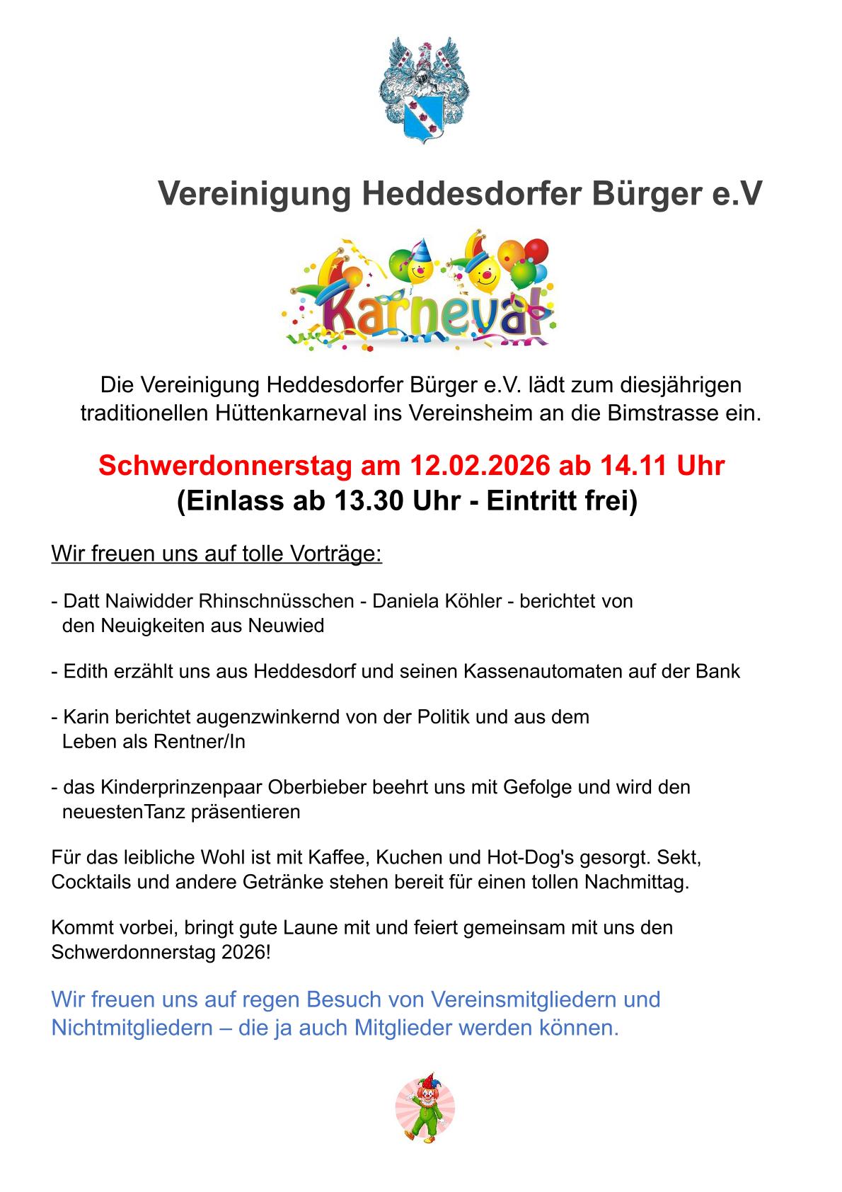 Primäres Ziel ist der Erhalt von Bräuchen und Traditionen. Wir wollen ausserdem die soziale Komponente in Heddesdorf durch unsere Vereinsheim stärken. Hier ist jeder herzlich willkommen.